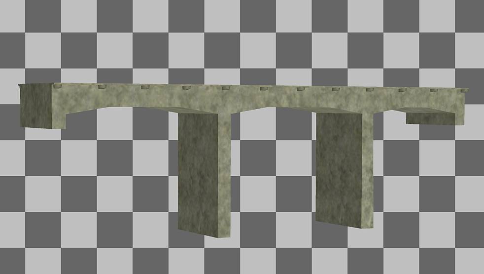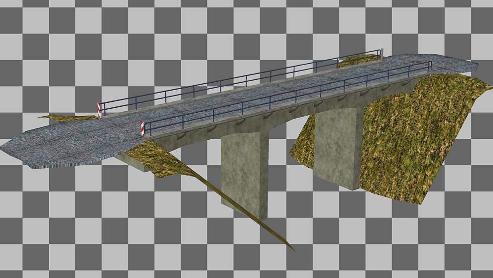 Die recht steilen Böschungen sind im unmittelbaren Brückenbereich direkt angebaut, damit es keine Rasterpunktprobleme gibt. Die geringe Breite der Straße im Brückenbereich, für die es keine passenden Straßensplines gibt, habe ich bereits im Modell mit einem Fahrbahnbelag ausgestattet, der sich außerhalb der Brücke absenkt, um im Anschluss-Straßenspline zu verschwinden.Die Gleiskoordinaten auf der Brücke (zur Verwendung mit dem unsichtbaren Straßenspline) enden links und rechts bereits 2 m vor dem Ende der Brücke, um Raum für das Anlegen einer unsichtbaren Weiche zu schaffen, bevor es mit dem sichtbaren Straßenspline weitergeht..
