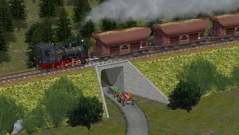 Die Brücke im Konstruktionsprogramm; sie hat links und rechts Gras- und Sand-/Schotteransätze für einen nahtlosen Übergang zum Bahndammspline.